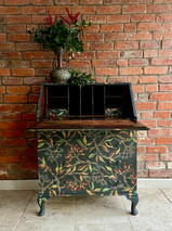 I began be slightly sanding the exposed walnut veneer back to get rid of the old damaged varnish. Then a gave the piece a couple of coats of a dark grey called, 'Graphite' Chalk Paint by Annie Sloan. Once this was dry I lightly drew on free hand the design using a white chalk to show on the Graphite. I then used rich warm Chalk Paint colours to paint in the design and gold metallic paint to highlight certain areas. Towards the end of the painting process I used a fine detail brush and Country Grey Chalk Paint to highlight a frost like pattern dancing on the twisting stems.
